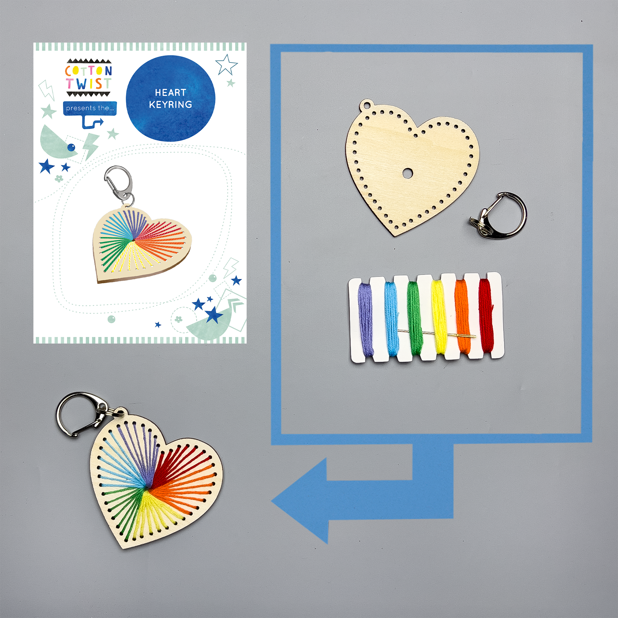 This kit includes a wooden heart ready to be stitched with the vibrant, colourful threads, allowing crafters to create their own unique patterns.