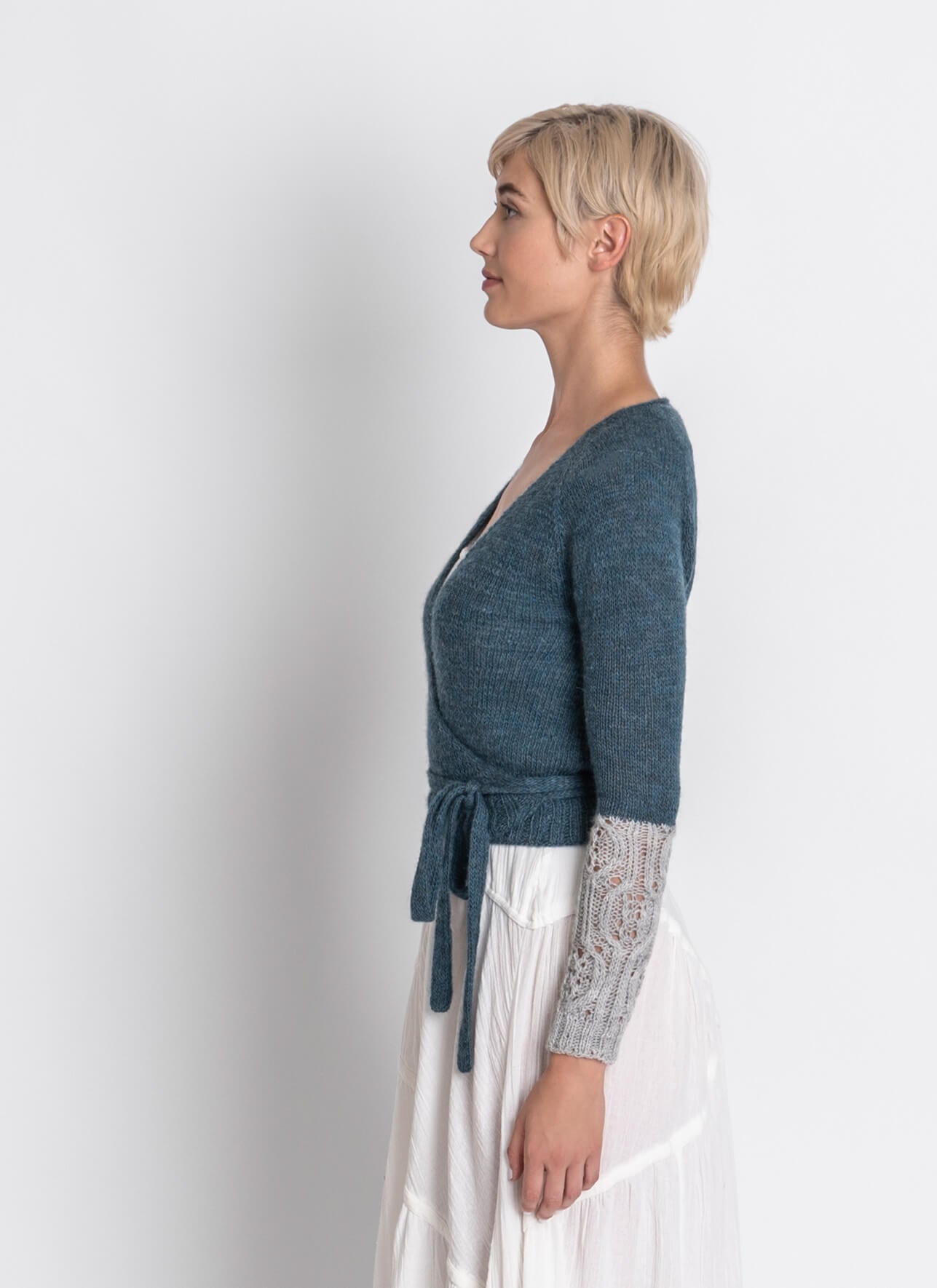 Perfect for layering, this ballet wrap is light and airy. A top-down raglan garment with intricate forearm lace details.